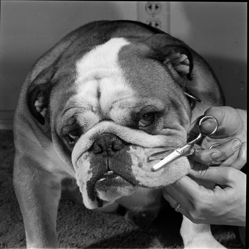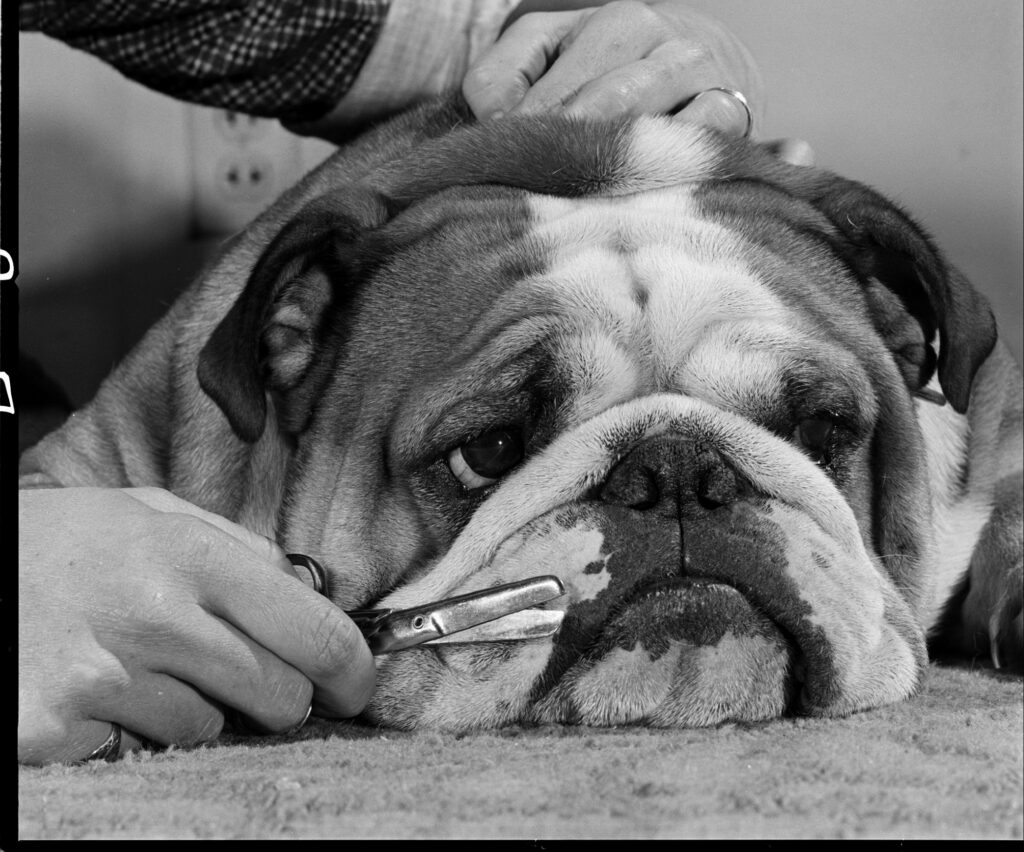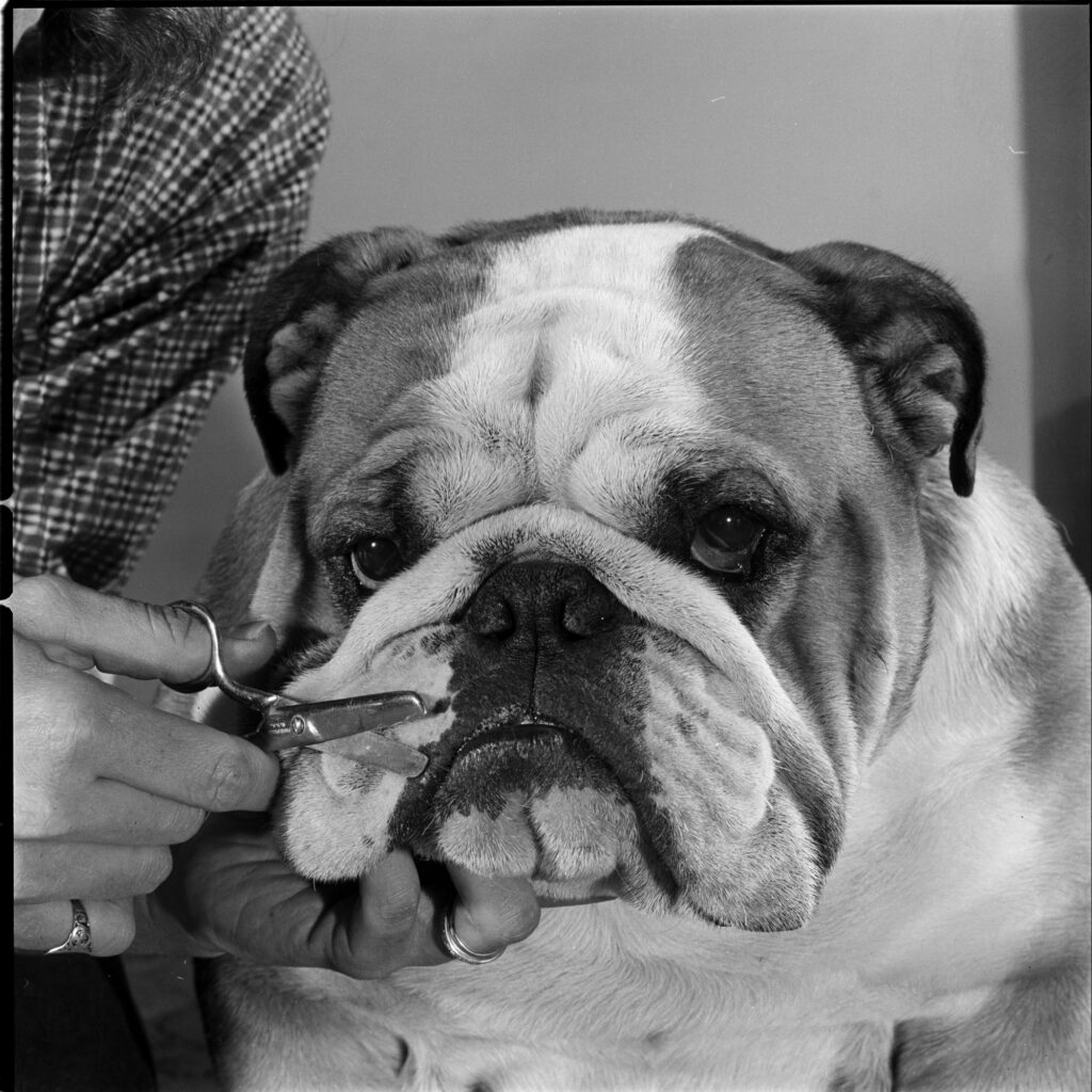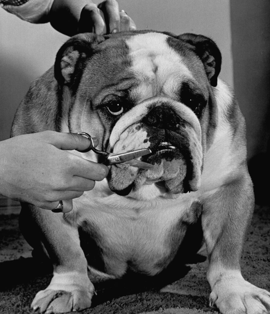 Kippax Fearnought, here going through his grooming routine in 1955, is the last bulldog to win Best in Show at the Westminster competition.