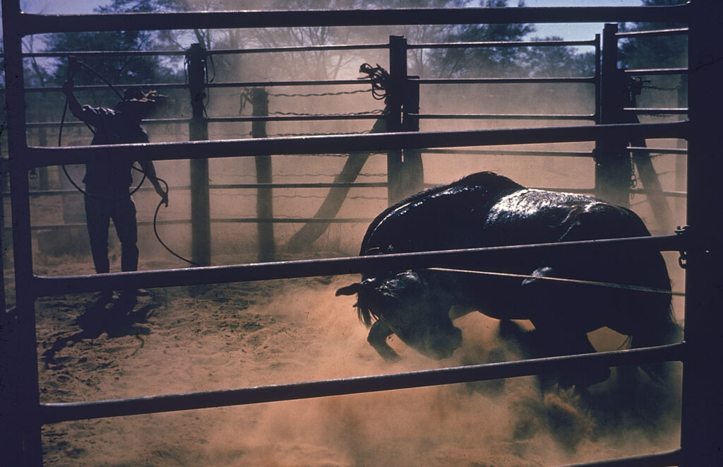 After five hours of struggle, Australian horse farmer Joe Mahood sat on top of exhausted horse he has finally tamed, 1966.