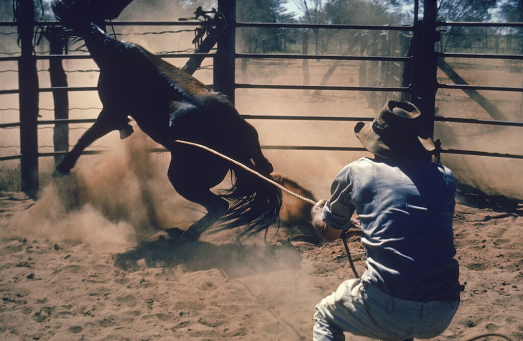 A stockman broke an untamed horse at a ranch in the Australian Outback, 1966.