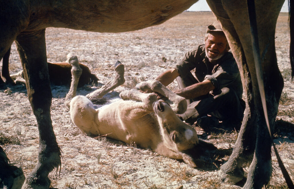 George Girdler, professional hunter, played with a foal in the Australian Outback, 1966.