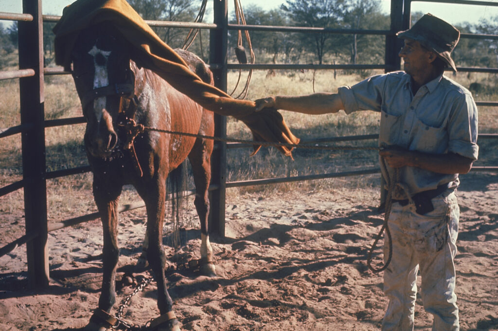 Joe Mahood, a rancher in the Australian Outback, gets a recently broken horse used to a saddle blanket, 1966.