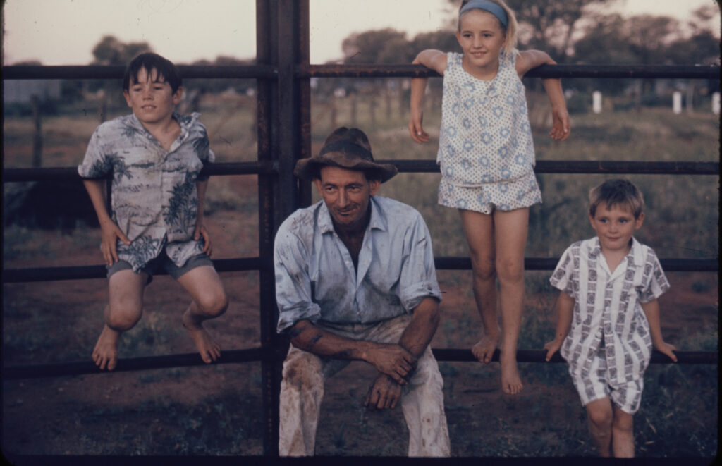 Joe Mahood, a rancher in the Australian Outback, posed with his three youngest children; his teenage daughter moved away to go to school, because there were none nearby,1966.