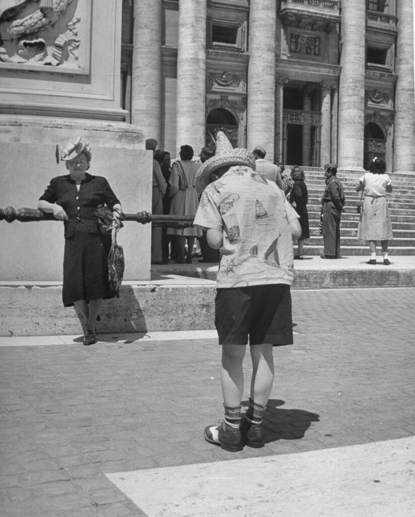 LIFE noted that manufacturers had been forced to make fabric shoes during World War II because of rationing that limited the supplies of leather (and also rubber). But during those war years manufacturers used dark-colored cloth so as not to draw attention to it. In 1946 some manufacturers switched gears and decided to the highlight the presence of cloth by using bright patterned fabric. LIFE said that this approach gave outfits a “startling footnote.”