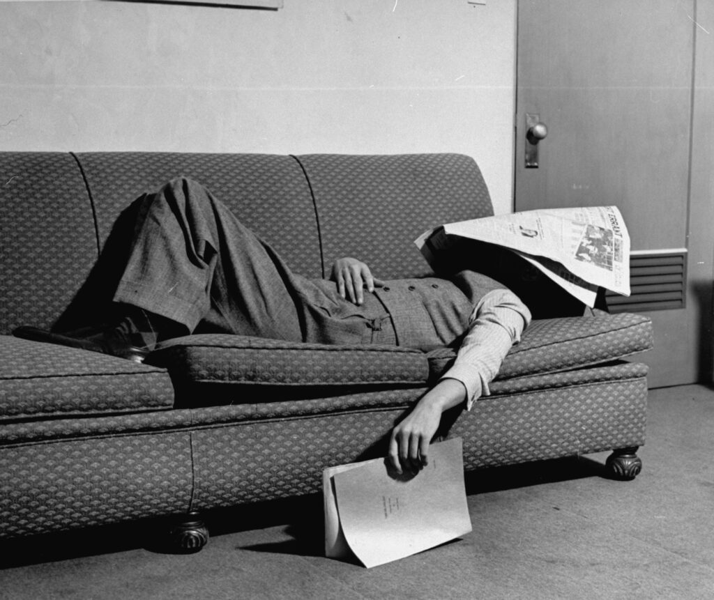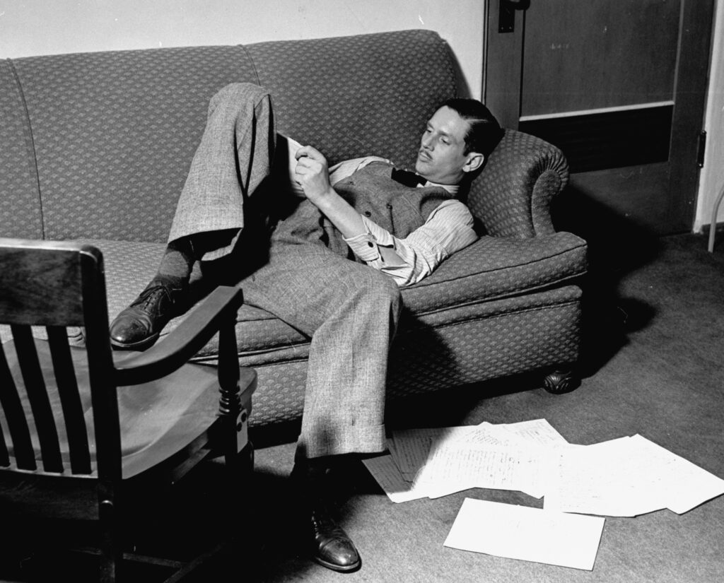 Writer Niven Busch lying on sofa with a newspaper over his face as he took a break from screenwriting, 1937.