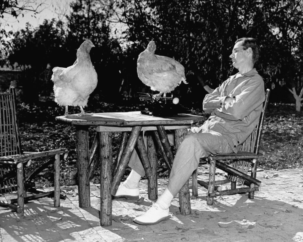 MGM screenwriter John Lee Mahin sat at his typewriter with chickens who were supposed to be, along with him, laying an egg, 1937; he would be nominated for an Academy Award for a movie he wrote which came out that year, Captains Courageous..