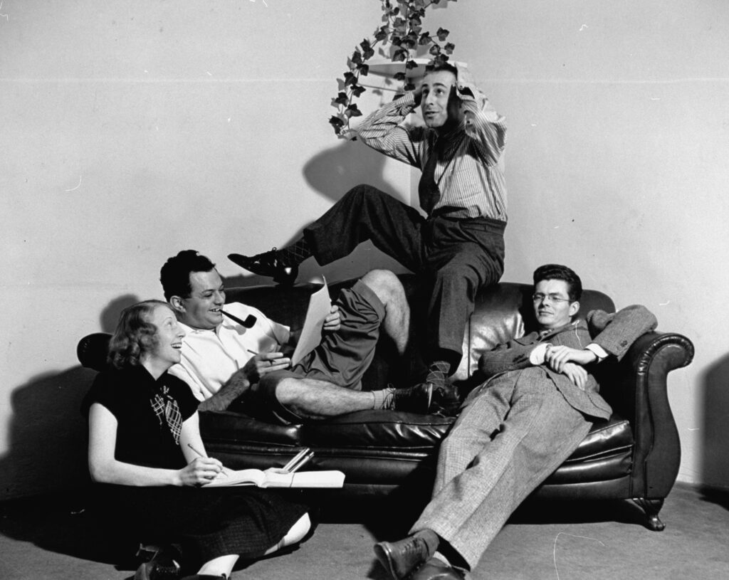 Warner Bros. studio writing trio (L-R on sofa) Jerry Wald, Maurice Leo, and Richard Macauley in the throes of writing Gold Diggers in Paris.