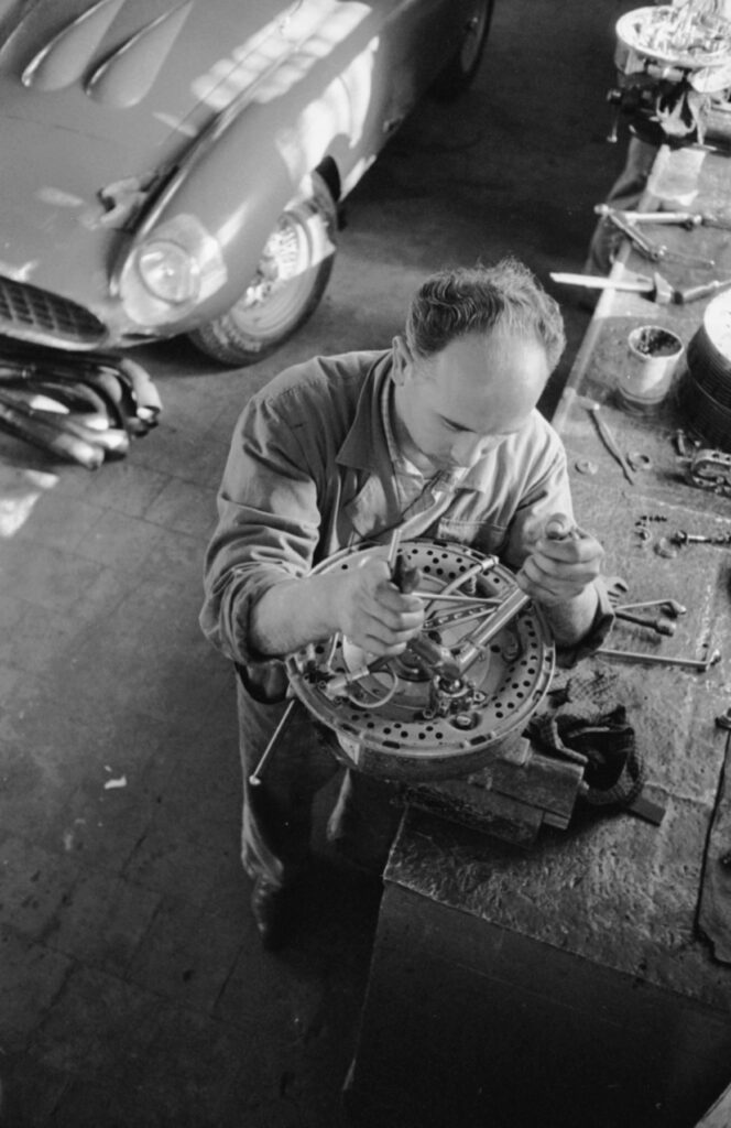 An unidentified Ferrari mechanic stripped a brake drum from a Lancia Ferrari D50 car at the company’s factory, Maranello, Italy, early 1956. This drum went into the car raced by Peter Collins at the Monaco Grand Prix..