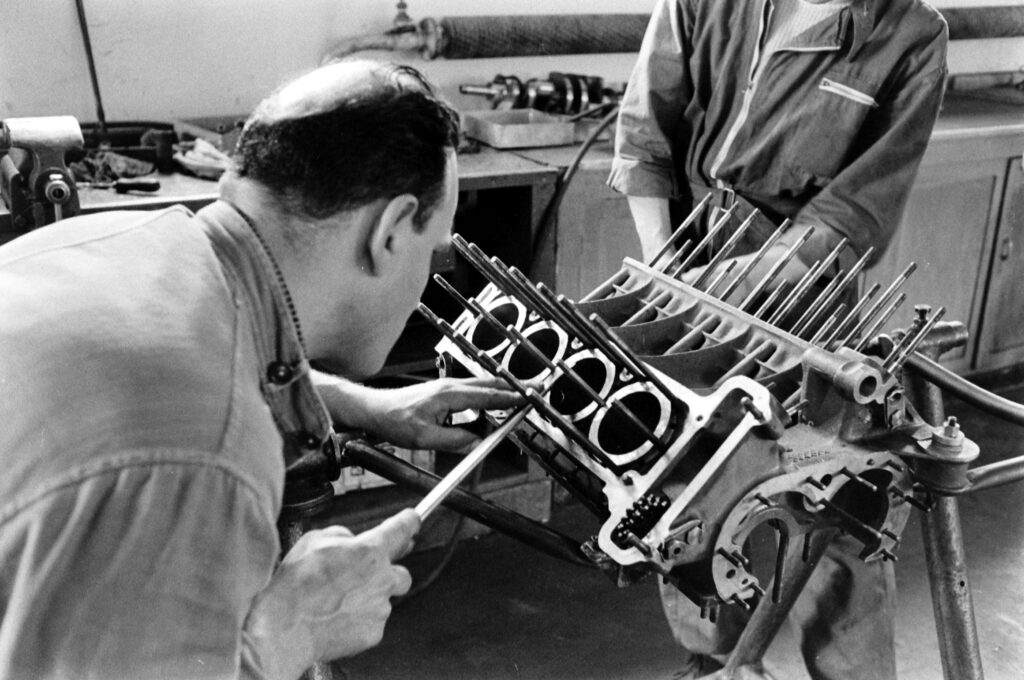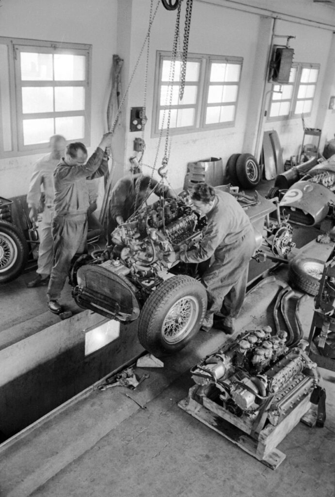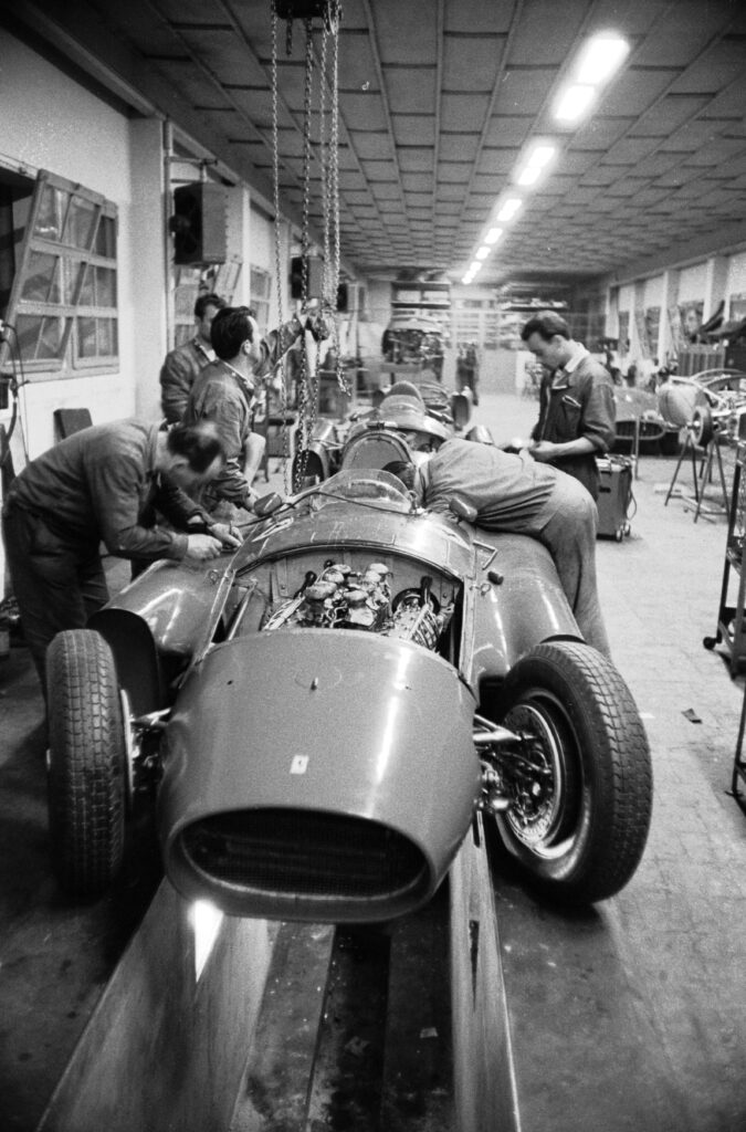 Ferrari head mechanic Vittorio Bellentani (center) watched as other mechanics lowered an engine into the chassis of a Lancia Ferrari D50 car that would be raced in the Monaco Grand Prix, Maranello, Italy, May 16, 1956.