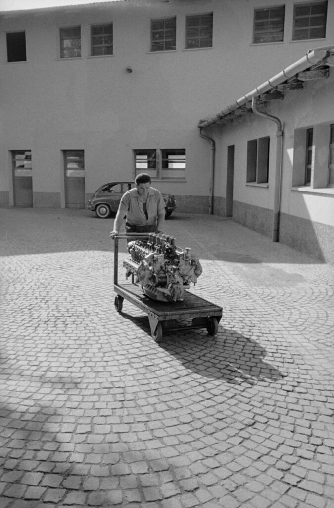 An unidentified Ferrari mechanic pushed an engine for a Lancia Ferrari D50 car to be raced in the Monaco Grand Prix, on a cart at the company’s factory, Maranello, Italy, early 1956.