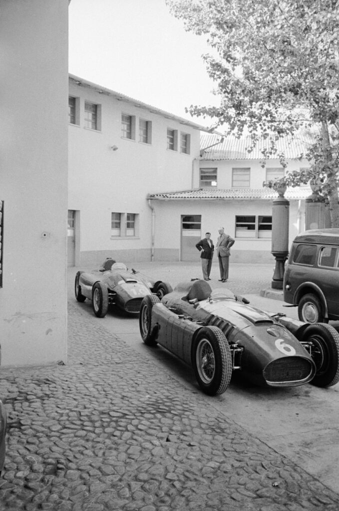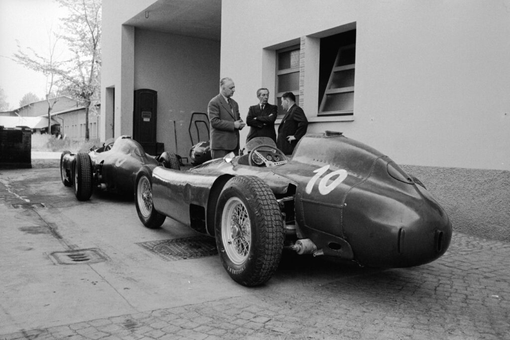 Outside the Ferrari factory, head mechanic Vittorio Bellentani (in dark blazer) and company namesake Enzo Ferrari stood near several Lancia Ferrari D50 cars that would be raced in the Monaco Grand Prix, Maranello, Italy, early 1956.