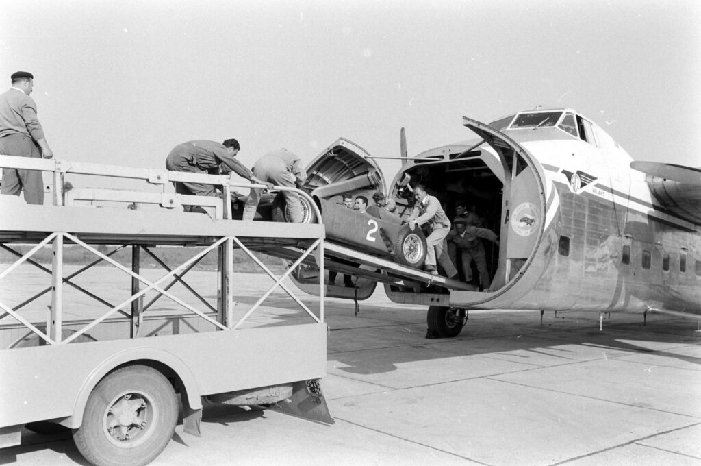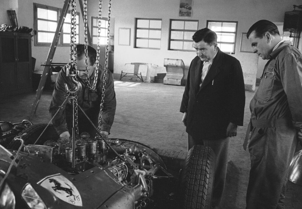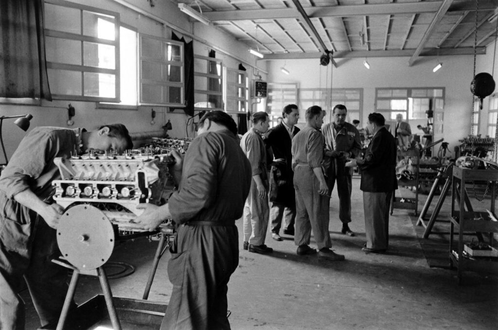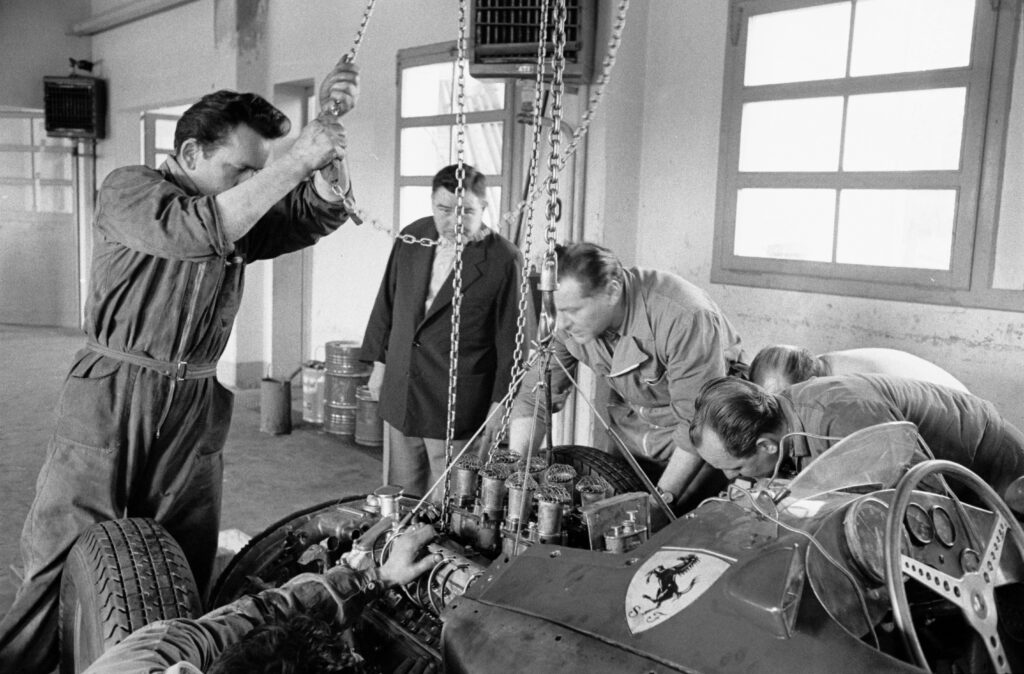 Ferrari head mechanic Vittorio Bellentani (second left, in dark blazer) watched as other mechanics lowered an engine into the chassis of a Lancia Ferrari D50 car (which will be raced in the Monaco Grand Prix) at the company’s factory, Maranello, Italy, early 1956.