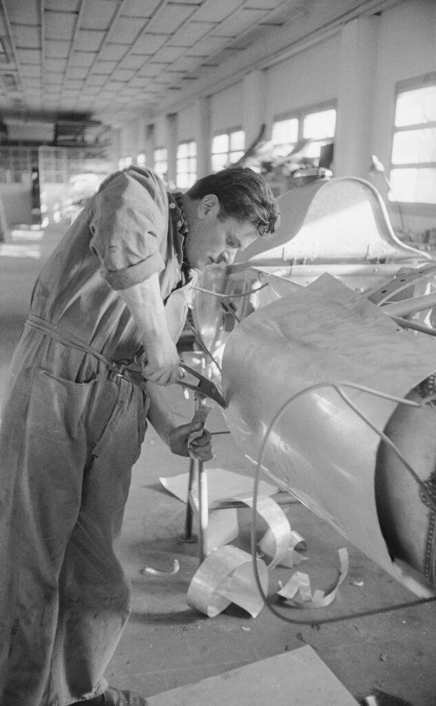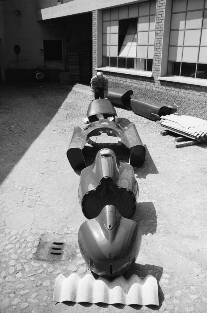 An unidentified Ferrari mechanic inspected the body shell segments for a Lancia Ferrari D50 car outside the company’s factory, Maranello, Italy, early 1956.