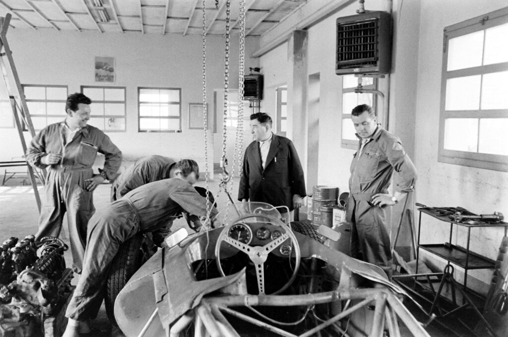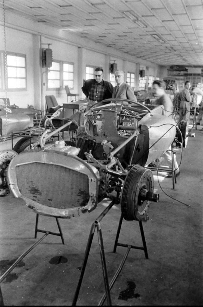 Mechanics worked on building a car for the Monaco Grand Prix at the Ferrari plant in Maranello, Italy, 1956.