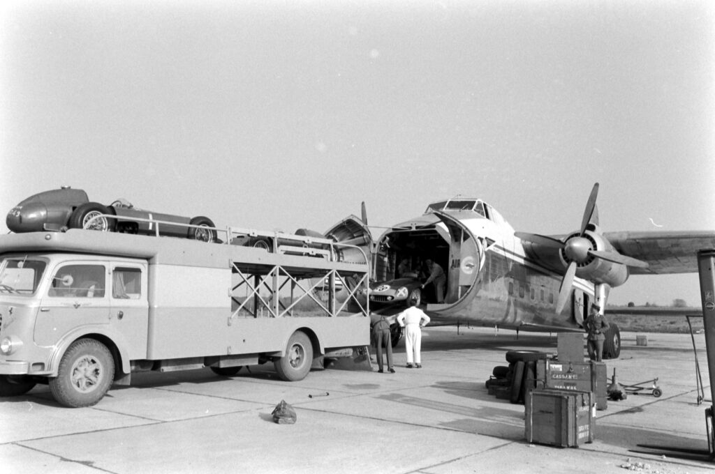 A Ferrari car on its way to the Monaco Grand Prix, 1956.