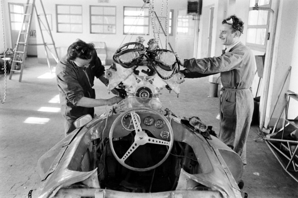 Ferrari mechanics lowered an engine into the chassis of a Lancia Ferrari D50 car at the company’s factory, Maranello, Italy, early 1956.
